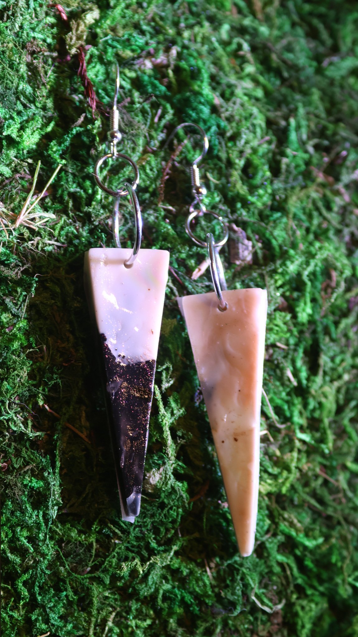 These earrings are lightweight amirite (recycled and ethically-sourced HDPE) with a light shimmer treatment. They are one of a kind and made from repurposed materials found in central Ohio. They are a conversation starter with their distinctive style. The material has natural dissimilarities as a result of the reformation process.