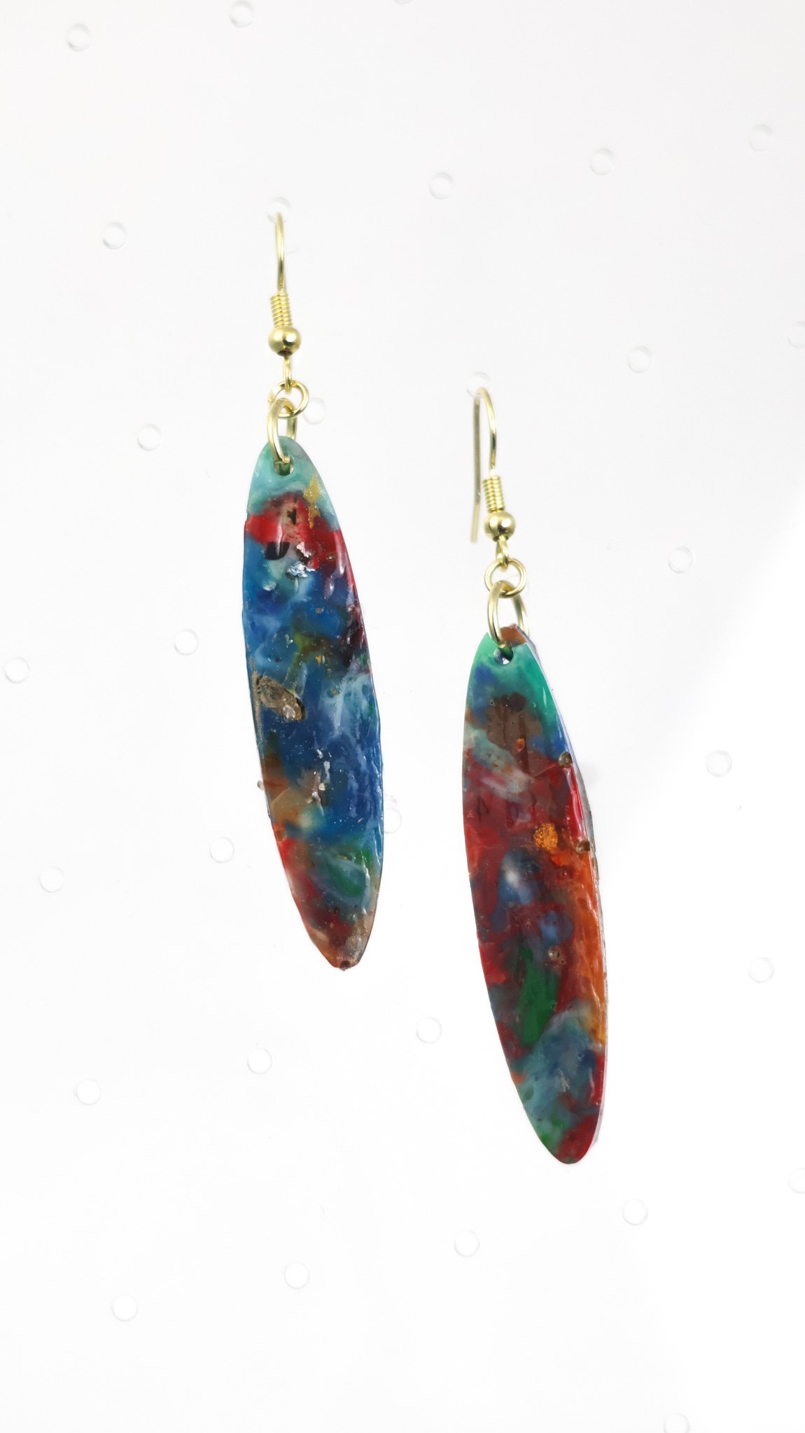 These earrings are lightweight amirite (recycled and sustainably-sourced HDPE). They are one of a kind and made from repurposed materials found in central Ohio. They are a conversation starter with their distinctive style. The material has natural dissimilarities as a result of the reformation process.